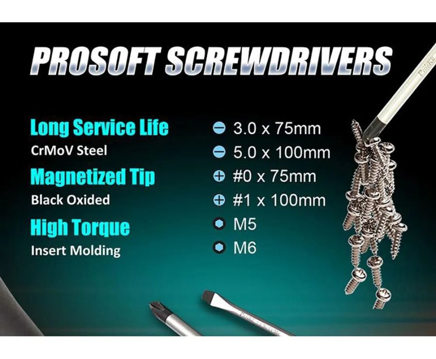 • Pro-Soft screwdriver set includesSL3, SL5,PH#0,PH#1, socket 5mm & 6mm feature the maximum torque and user comfort