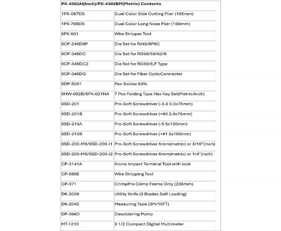 PK-4302 is a professional PC Networking Tool Kit, including Digital MultimeterTesterCrimperStripperPliersPunchDown Tool and Soldering Iron for systemintegratorsand MIS engineers of computer repairing and networking installation.