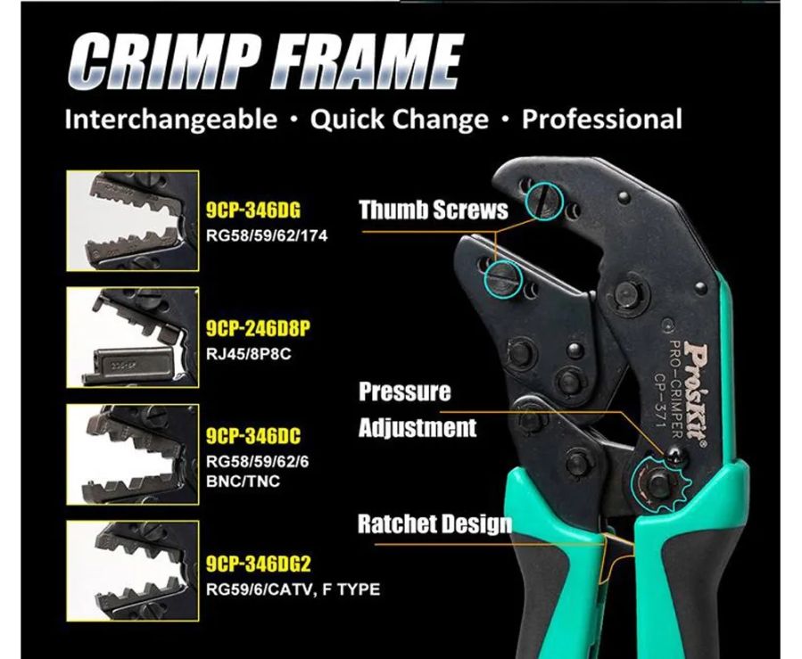 • The new Supercrimp crimper with 4 die set for crimping RJ-45/8P8C Modular plugs, BNC, TNC, F and Fiber optical connectors