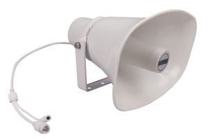 A durable weather resistant horn speaker designed for use in conjunction with the Merlaud IP communicator PA system. It features an in-built amplifier and can be powered by 12-24V DC power supply (M8937D) or PoE as required. The sturdy mounting bracket is u shaped and secured with stainless steel hardware.
