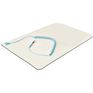 The anti-static mat complies with the ANSI / ESD S 4.1 surface resistance standard. The mat is composed of two PVC layers with a total thickness of 0.08 in (2 mm). The bottom black layer is textured for surface adhesion. The mat includes a coiled grounding cable which is long enough (6.6 ft / 2 m) to reach the most common grounding points.