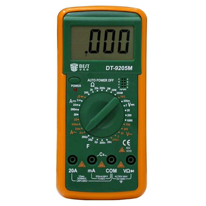 1. The BEST DT-9205M digital multimeter is an easy to operate, accurate readings, full-featured, compact, easy to carry, use battery-powered handheld large screen LCD Multimeter, DT-9205M digital multimeter for three and a half, the table can be used to Measure DC voltage / electric, AC voltage / current, resistance, capacitance test, diode test, transistor HFE measurement and circuit off, etc..