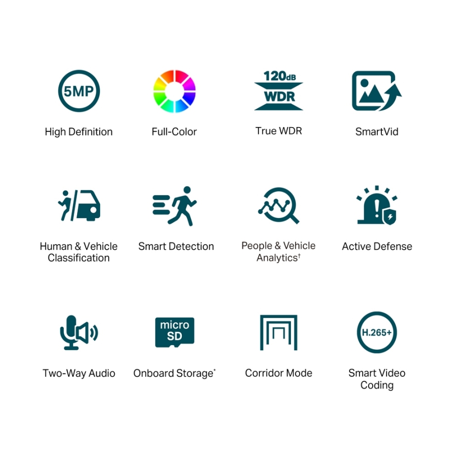 5MP Super-High DefinitionMonitor 24-hour clear and colorful details even in pitch dark night. VIGI Full-Color camera provides maximum 5MP resolutions and ensures colorful monitoring with its large-aperture lens, high-sensitivity sensor, and attached supplemental lights.