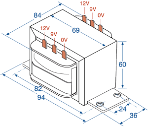 Powertran EI-Core 240V AC mains transformer with 6.6A dual multi tapped secondary configuration. Two sets of 0V, 9V and 12V secondaries are available at a maximum current of 6.6A (max current when 9V secondaries connected in parallel) . Primary is fitted with 200mm fly leads. Secondary taps have solder tags. Fully electrical authority approved for AS/NZS 61558.2.6.