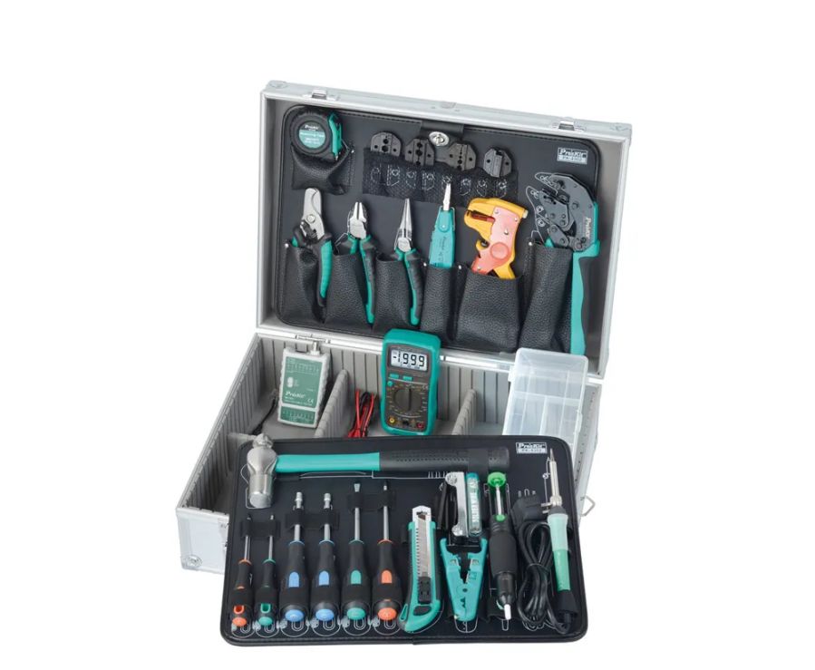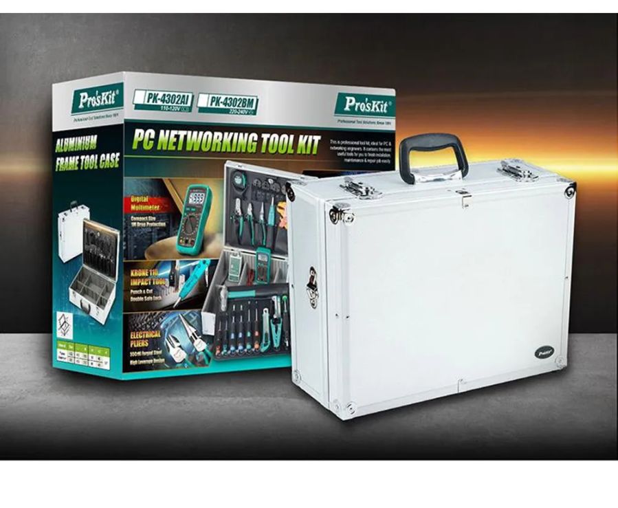 PK-4302 is a professional PC Networking Tool Kit, including Digital MultimeterTesterCrimperStripperPliersPunchDown Tool and Soldering Iron for systemintegratorsand MIS engineers of computer repairing and networking installation.